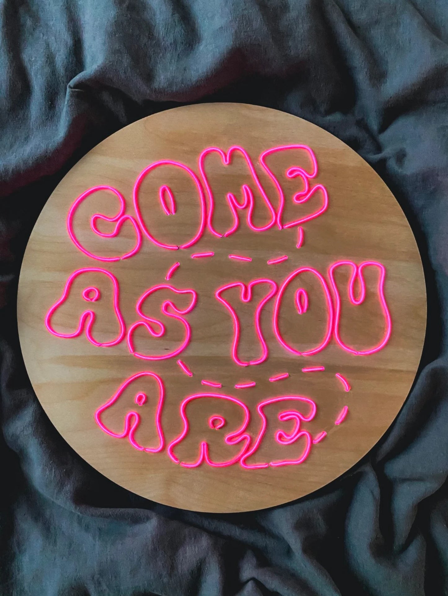 Introducing our Handmade El Wire sign featuring the words “Come As You Are” in a retro font – a versatile piece that can be easily hung or placed anywhere. Expertly crafted on a sturdy cherry wood backboard, it comes equipped with a hidden On/Off button, allowing you to effortlessly turn the sign on, create a flashing effect, or activate a strobe mode for an added visual impact. Please note that the pictured item was designed with pink wiring.
